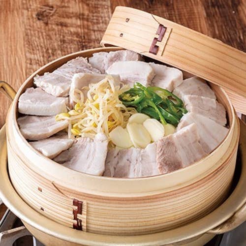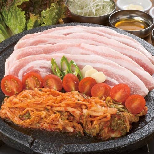 カリッと焼けた豚肉をサンチュや豊富な韓国薬味と一緒に味わえば、まるで韓国屋台にいるような気分になります。